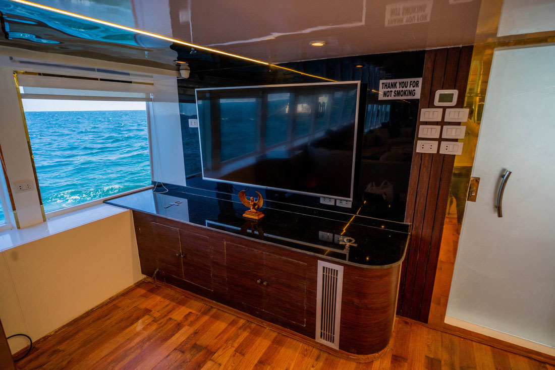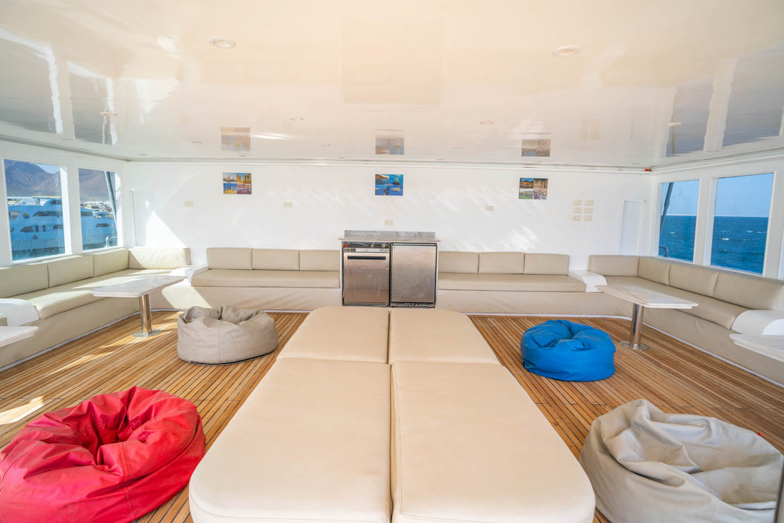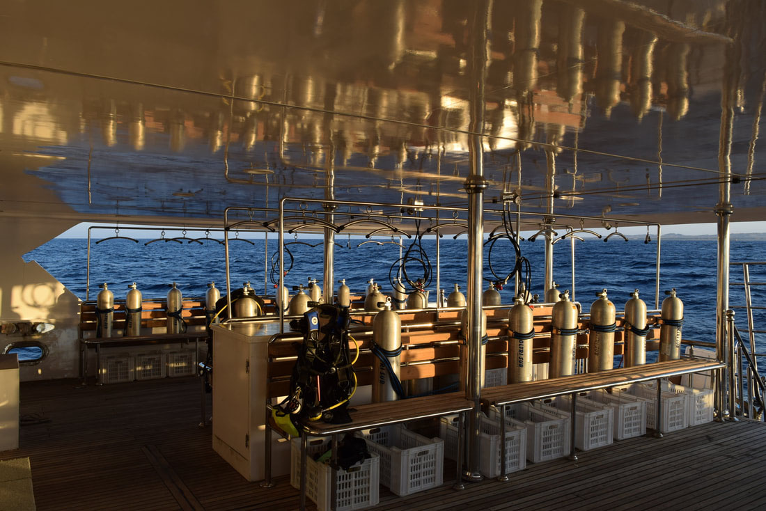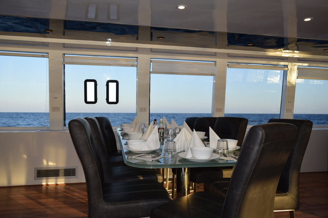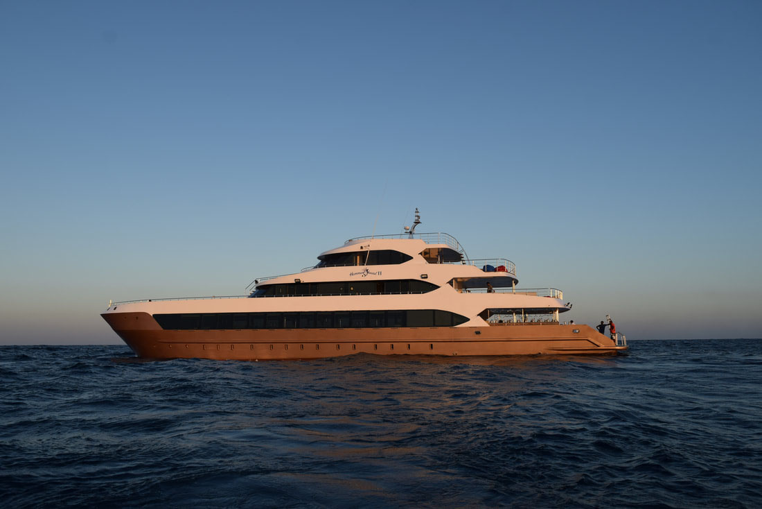 Experience the thrills of the Daedalus reef, Fury Shoal and Elphinstone aboard the beautiful Hammerhead II, a 5 deck luxury diving liveaboard safari boat. Equipped with 16 spacious cabins, cleaned daily by our onboard team, it is able to host up to 30 divers per safari. The dive deck on-board is the perfect place to set up your equipment and get prepared for the famous sites or even challenge yourself to a new diving course, such as our new, thrilling scooters! Hammerhead II’s restaurant and dining facilities serve delicious buffet style meals for breakfast, lunch and dinner, while the saloon houses all-day snacks, hot drinks and soft drinks. Whether you are diving into the crystal blue waters or relaxing around the boat, the crew on board will be there to assist you with top-tier service, to guarantee you a memorable experience to reminisce about until your next adventure!